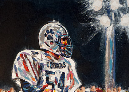 One night on the Gridiron, acrylic and hockey tape on wood panel, 18" x 14", 2018, sold.